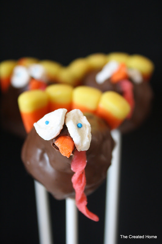 After making cake balls, I pulled and formed the head from the cake ball. Once covered in chocolate I placed all the Turkey "parts" where they belonged. If the chocolate dries before you are able to place things on, use a dab of chocolate like glue. For the beak, cut the candy corn length wise. Break off the yellow end and white tip leaving you with an orange beak. The red Starburst candy needs to be softened in the microwave, flattened and cut into strips. I then twisted it. The whites of the eyes are Marshmallows divided in 1/3. I then stuck a single sprinkle in the middle. I used both blue and green, to add to the different personalities my Turkeys were taking on.